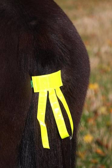 Laita muutama häntäjouhi tarran väliin, niin heijastin pysyy paikallaan. Tarrassa on joustonauha, joten se pysyy tiukasti paikallaan. Helppo laittaa.