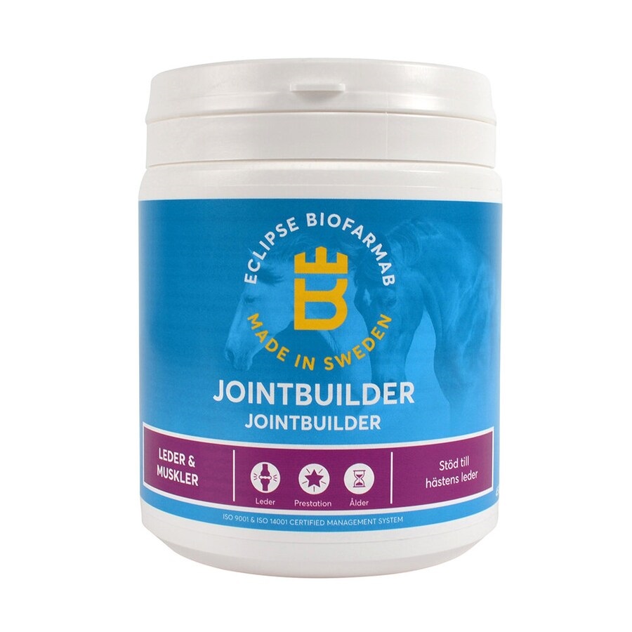 Eclipse Biofarmab Jointbuilder innehåller flera viktiga näringsämnen för att ge hästen en välfungerande rörelseapparat. Idealisk för aktiva hästar, äldre hästar, samt hästar som utsätts för hård ansträngning.