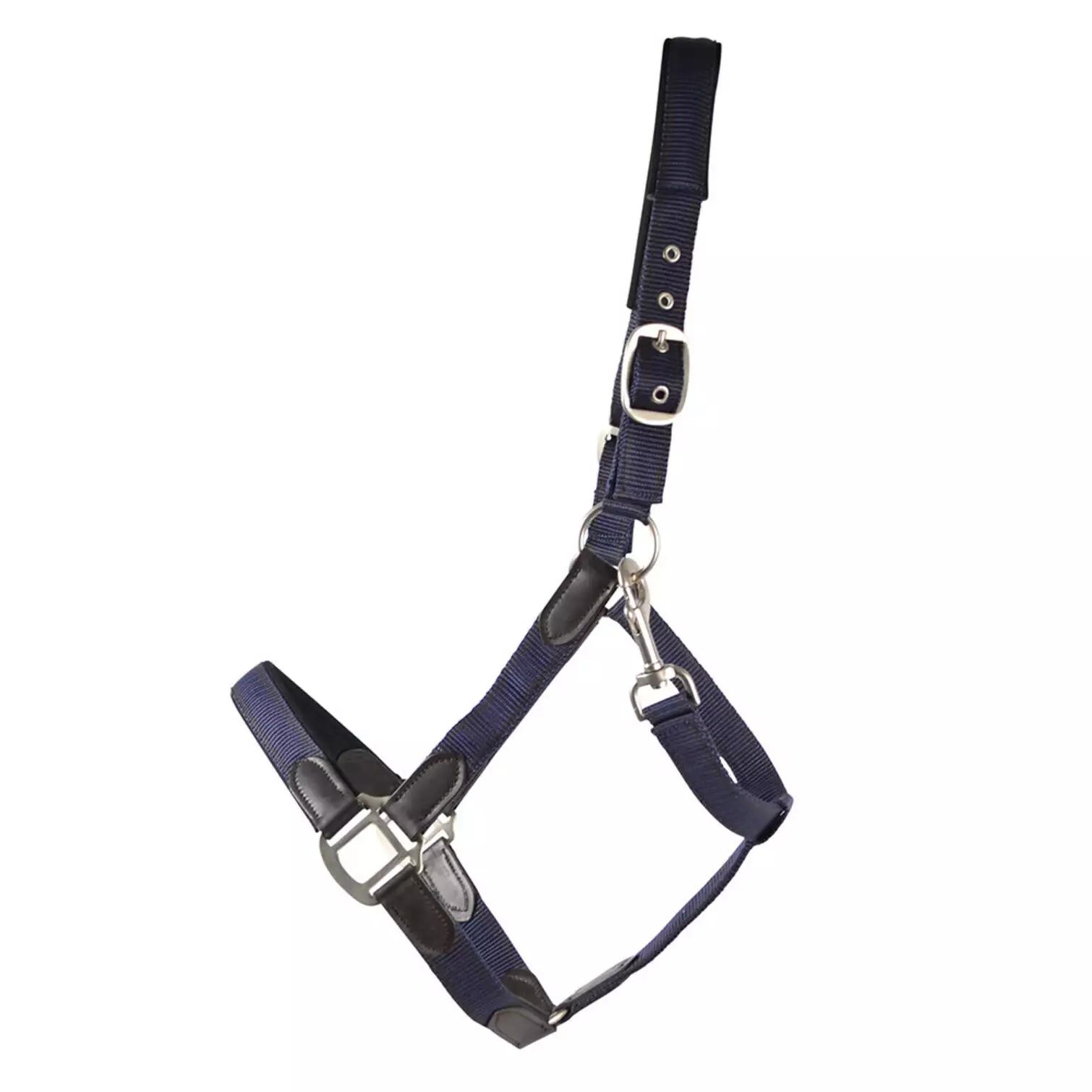 Elegant genomarbetad textilgrimma med mjuka läderdetaljer av högsta kvalitet. Vadderad nos och nackstycke. Nickelfria metallbeslag.
