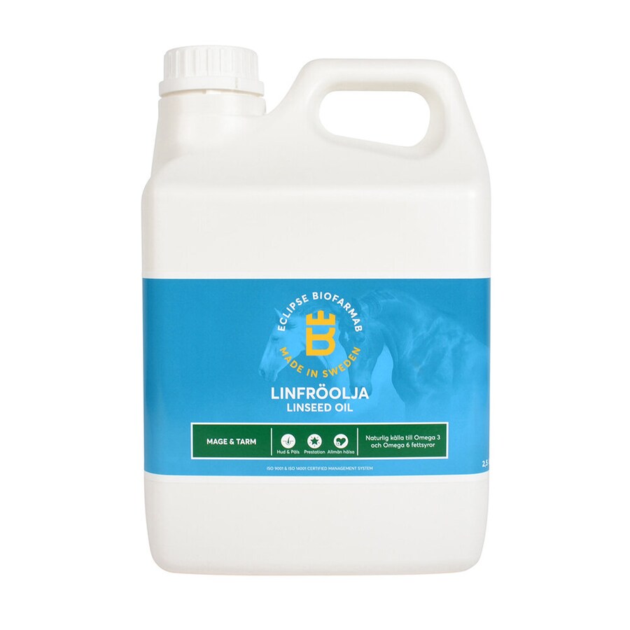 Eclipse Biofarmab linfröolja är pressad i Sverige av svenskodlade linfrön och håller hög kvalitet. Att hästen mår bra av linfröoljan visar sig nästan omgående i form av blankare hårrem.