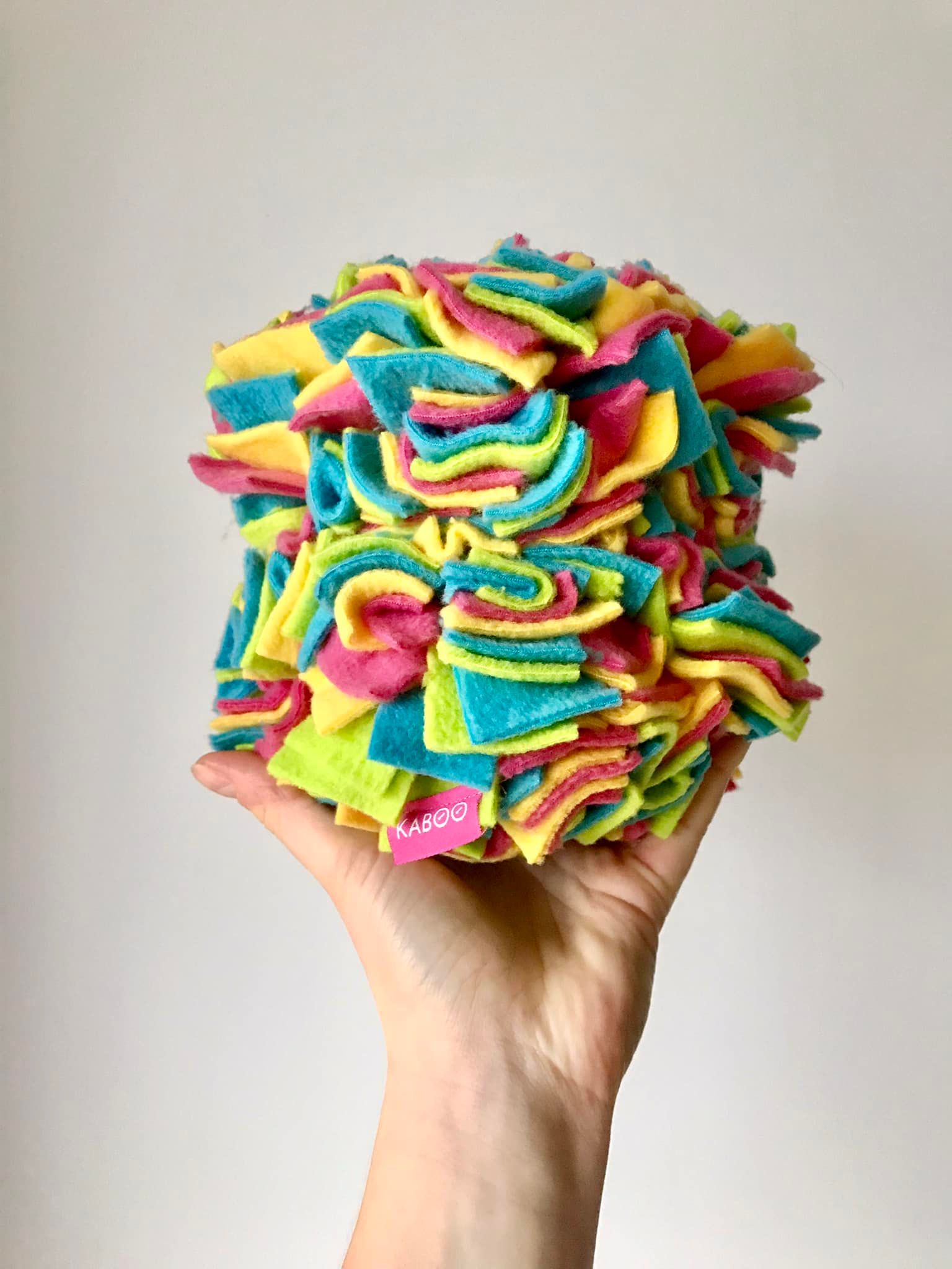 KABOO SNIFFERSit ovat nuuskimisleluja, joissa on valtava määrä paksuja ja pehmeitä fleeceliuskoja tai taskuja, joiden väliin voit piilottaa koirasi lempiherkut tai kuivaruokaa - sinne mahtuu vaikka koko ateria. Herkkujen etsiminen ja nuuskiminen vie koiralta pitkään ja antaa koiralle valtavan annoksen henkistä työtä.