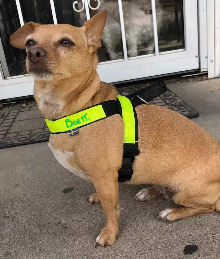 Mustalle polyesteri nauhalle ommeltu näkyvä keltainen heijastin. Säädettävä vatsavyö, jossa pikalukkokiinnitys. Tukeva talutinvaljas, rengaslenkkikiinnitys tulee taluttimeen. Helppo pukea koiran päälle! Heijastinmalli antaa näkyvyyttä sekä eteen että sivuille.